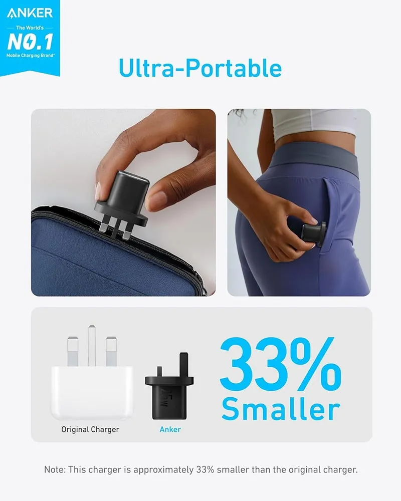 Compact and Portable – 33% smaller than standard chargers, with a foldable plug for easy storage