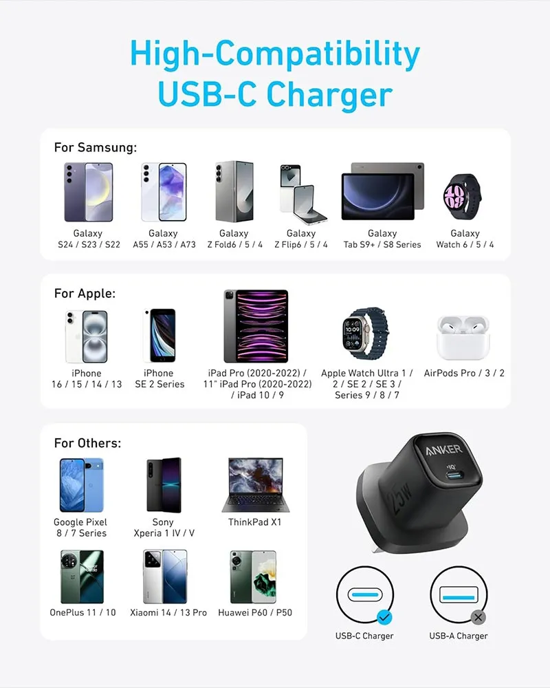 Charge your devices faster and more efficiently with the Anker Charger (25W, Compact). Optimized for Samsung smartphones, this 25W charger rapidly powers up your devices, getting your Samsung S24+ to 50% in under 30 minutes! Featuring a sleek, compact design, it’s about 33% smaller than regular chargers, making it the perfect travel companion. With universal compatibility, you can use it to charge Android smartphones, Apple devices, and more!