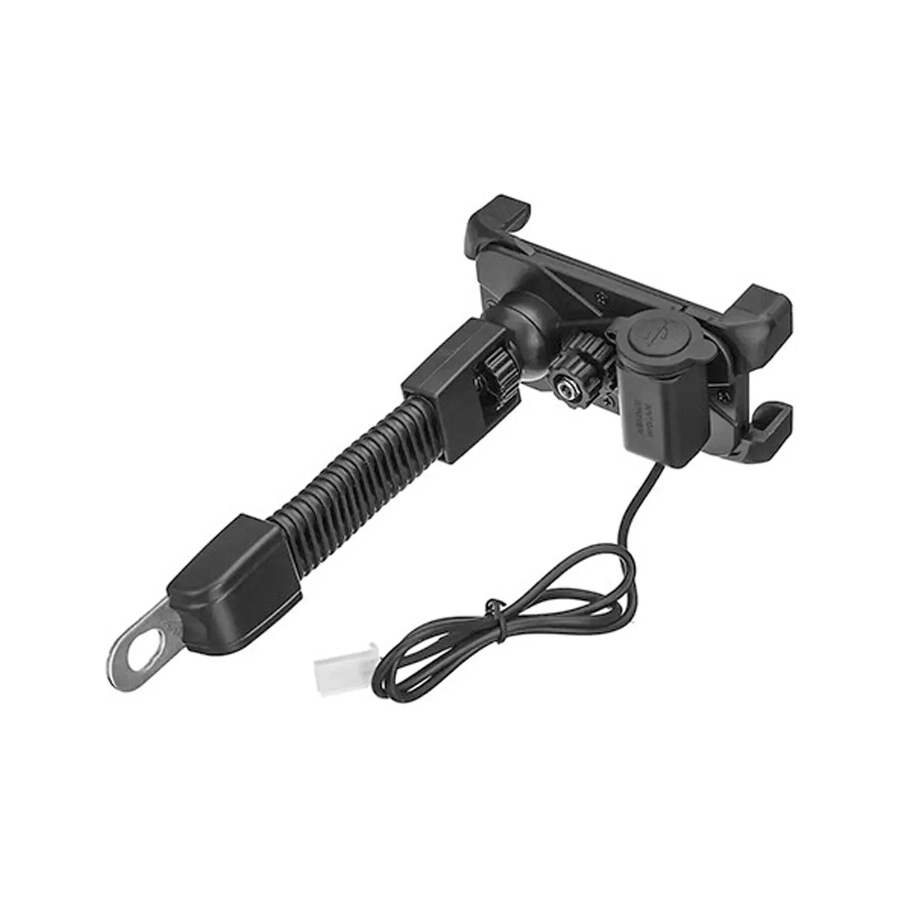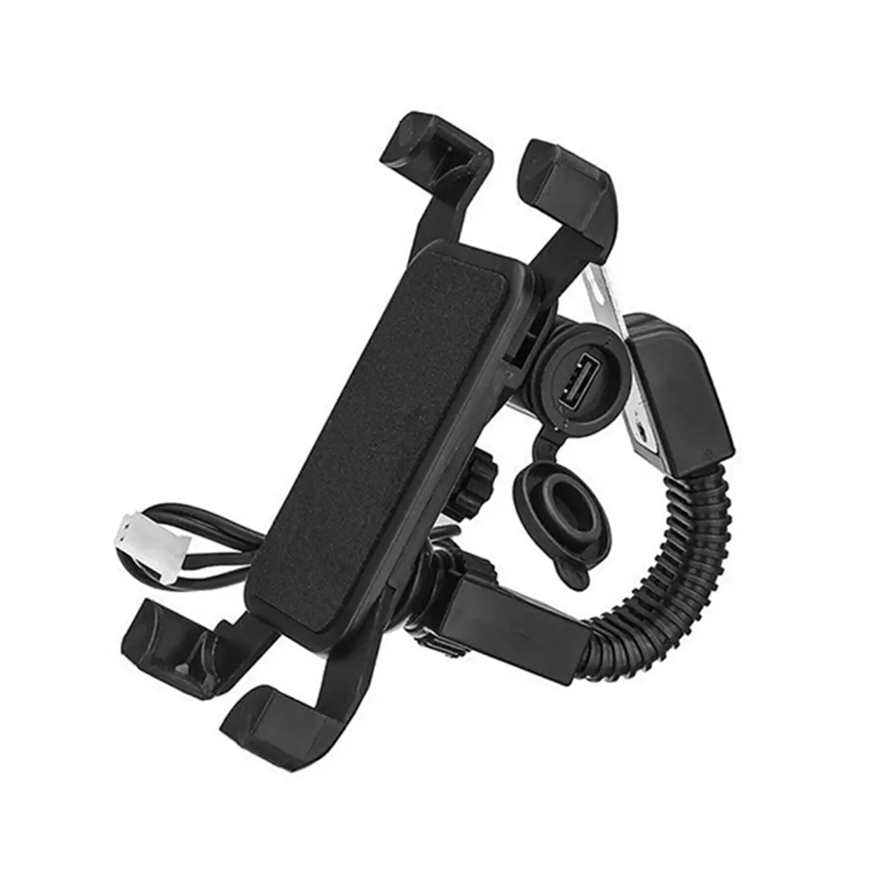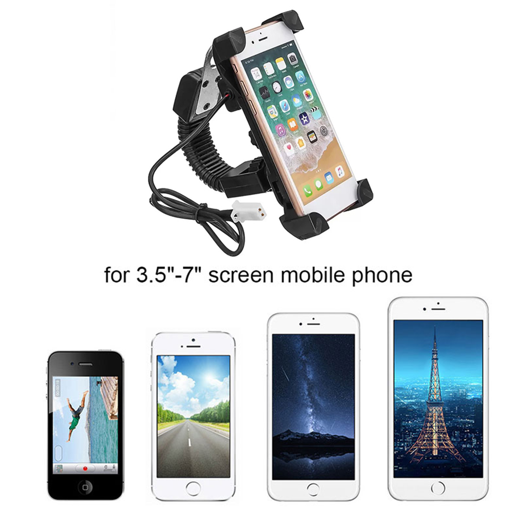 • Adjusts to fit 3.5 – 7in phones• USB charging port• Overload protection• 12V to 30V input voltage range compatible with a variety of vehicle typesSpecifications:• Material: ABS• Color: Black• Size: 12cm x 6.0cm x 4.0cm• Input voltage: 12 – 30V• Output voltage: 5V• Output current: 2A• Application range: 3.5″- 7″ devices• Mount type: Mounts on vehicle’s handlebars• Handlebar diameter size: 22mm-32mm• Charging cable length: approx 117cm• Weight: 200gPackage contents:• 1 x Motorcycle phone holder• 1 x USB charging cable & power supply