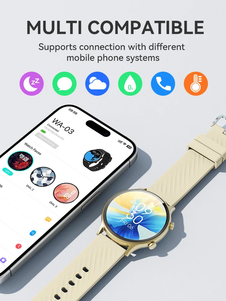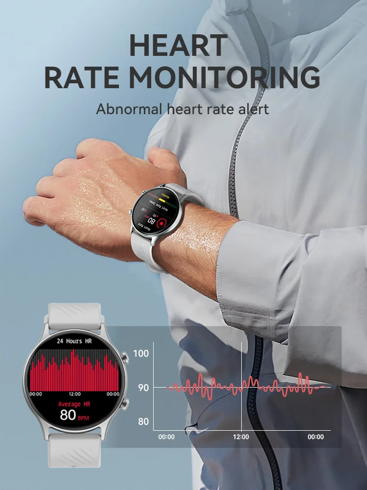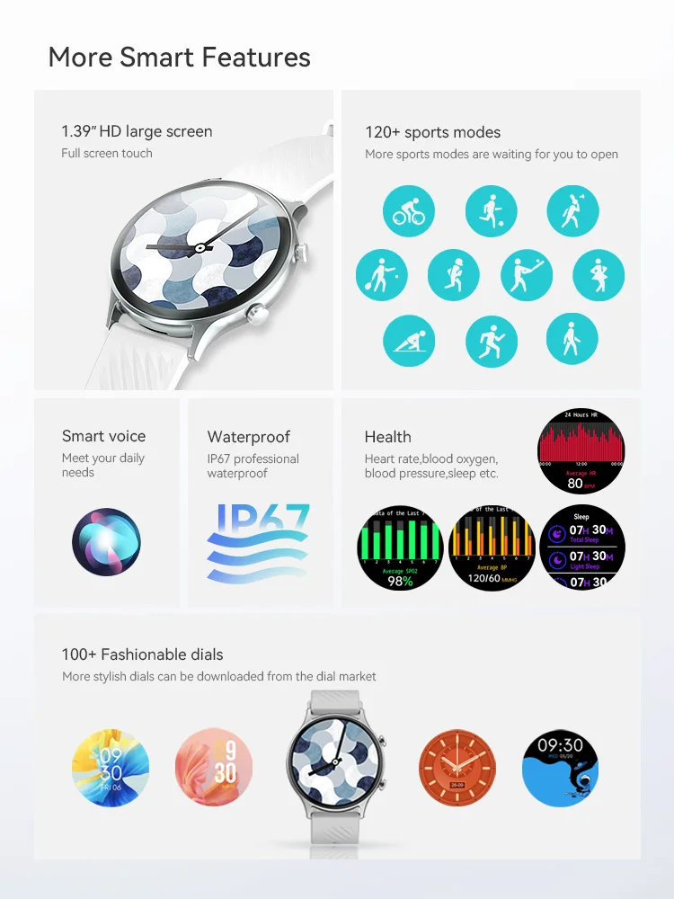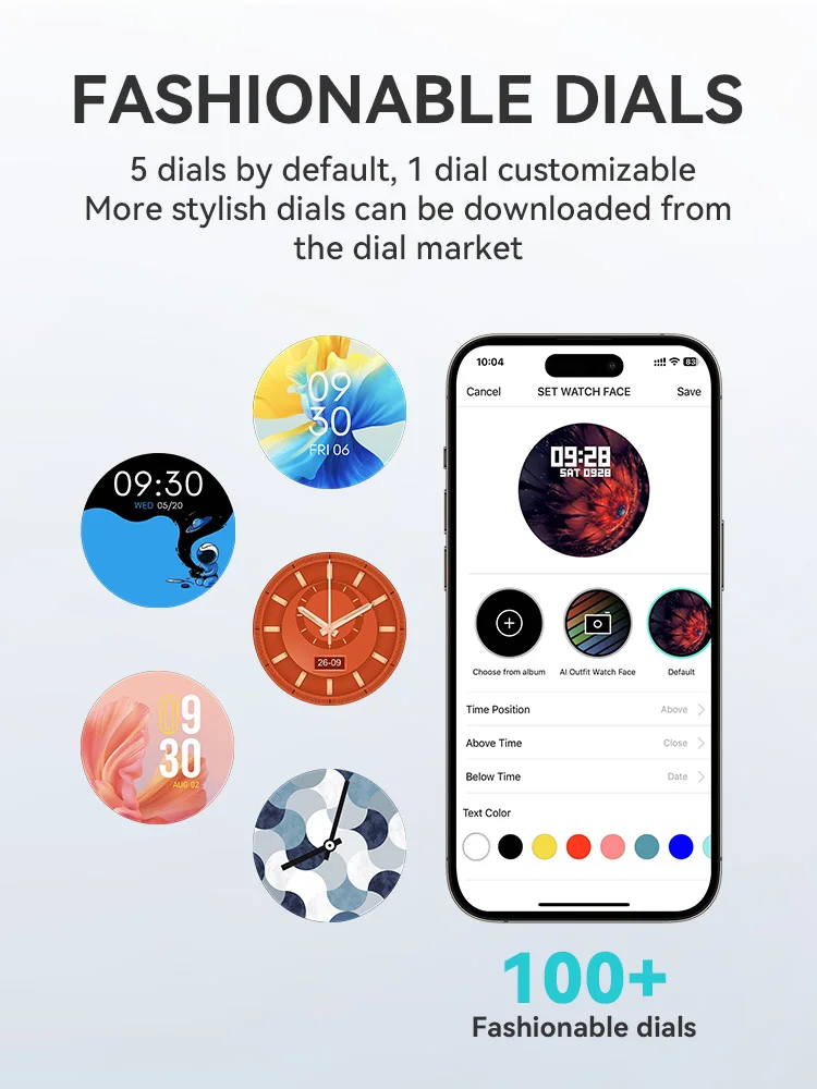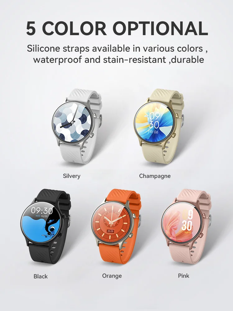 - Narrow-bezel touch control display, 100+ fashionable watch faces