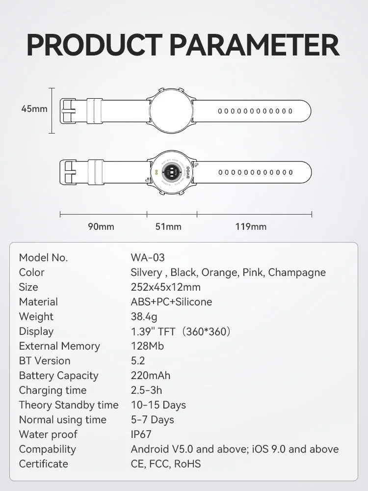 BWOO WA-03 Smartwatch Waterproof capability is IP67, which means that it will not experience water seepage or damage even when dropped to 1 meter underwater for 30 minutes. It is also a professional sports activity tracker with 123 kinds of sports modes, including walking, running, jogging, badminton, swimming, etc. Therefore, you can use it to track your sports data and plan your workout tempo accordingly.